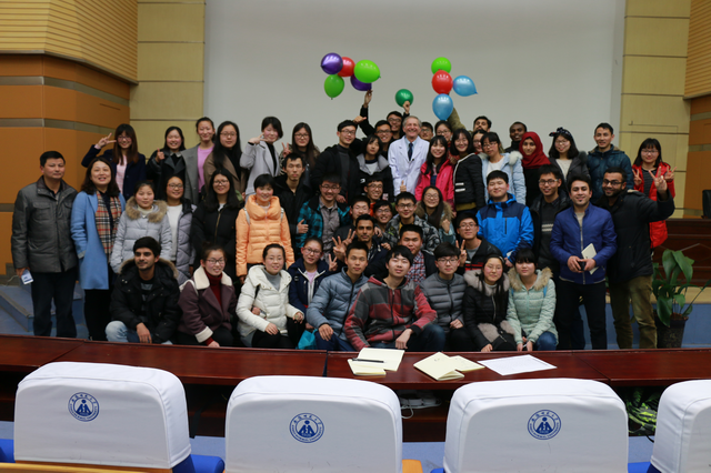 Peter J. Sadler教授以 “哪些元素是生命所必须的”问题引入,带领同学们逐一了解了元素周期表中的元素,并向同学们介绍了各元素在生活中、医学中的应用。Peter J. Sadler教授现场展示的蛋白质分子变色反应让同学们领略了分子科学的奇妙,不时地英式幽默也多次将现场气氛推向了高潮。在互动环节中,Peter J. Sadler教授利用有奖问答考量了同学的知识储备,并亲手为回答正确的同学送上奖品。部分同学也就自己感兴趣的问题向Peter J. Sadler教授进行了请教,Peter J. Sadler教授结合个人经验给出了诚恳的建议。整场讲座不仅展示了科学大家的严谨,同时Peter J. Sadler教授对相关科学知识的滔滔不绝,也充分展示了其渊博的知识储备。讲座结束后,同学们纷纷簇拥着Peter J. Sadler教授,请求合影和签名,久久不愿离去,Peter J. Sadler教授热情地满足了同学们的请求,并为同学们送上了诚挚的祝福。