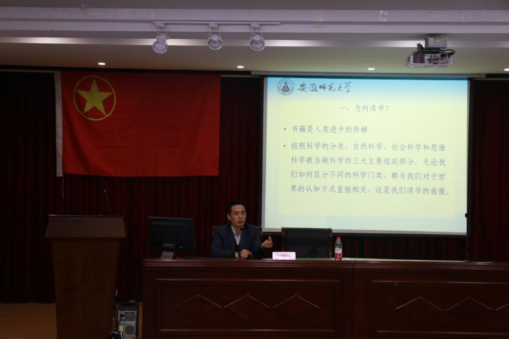 团课伊始,戴教授以朱光潜、达尔文等各个领域大家之语引入“读书”主题。他从“为何读书”、“如何读书”及“读书为何”三个方面,援引诸多化学科学家的事例为大家论谈青年大学生对于读书、学问及科学的理解。为何读书?读书以明智,以予人类进步的阶梯。若想在科学研究领域有所建树,必应遨游浩瀚书海,真正有成就的科学家莫不如是。如何读书?戴教授指出,读书人应具有五大基本素质:敏锐的观察洞见能力、清晰的阅读理解能力、精确的分析提炼能力、积极的怀疑反思能力及严格的批判评论能力,做一个真诚、宽容、坚忍、智慧的读书人。读书为何?真理、自由与快乐贯穿成长,阅历深浅不同,自书中所得亦不同。讲座尾声,戴教授鼓励同学们应充分利用大学时光与丰富图书资源,饱览群书以提升自我。